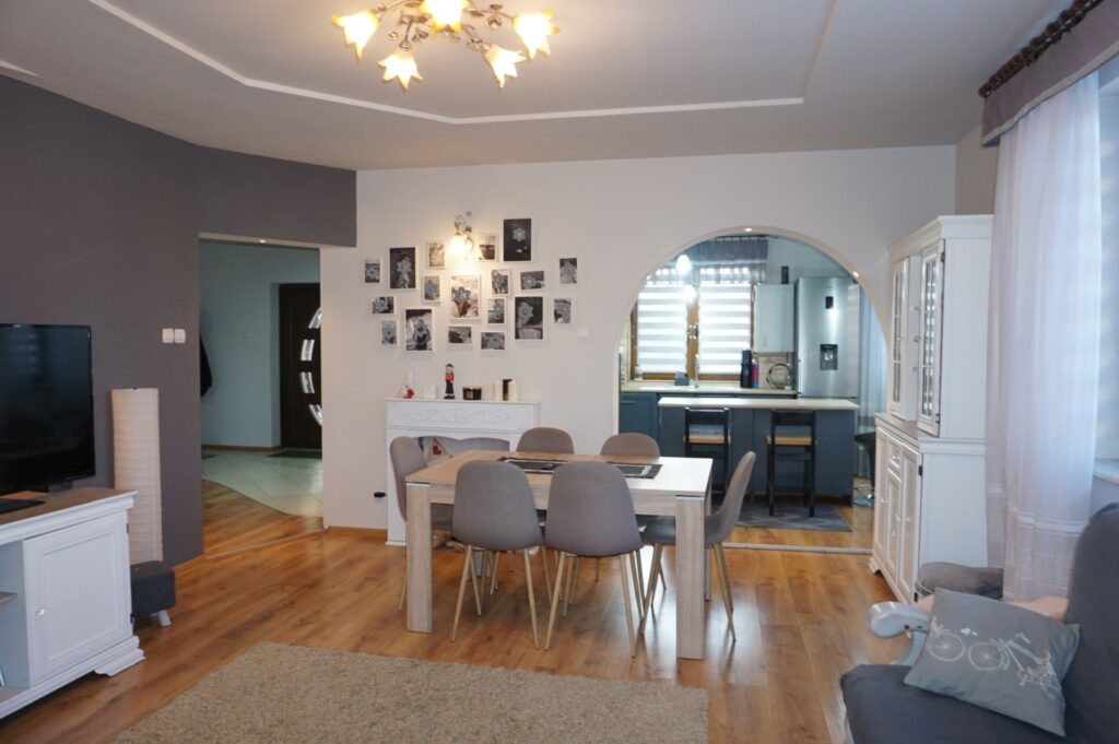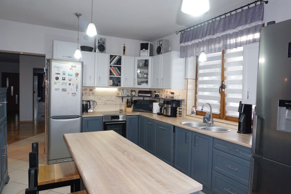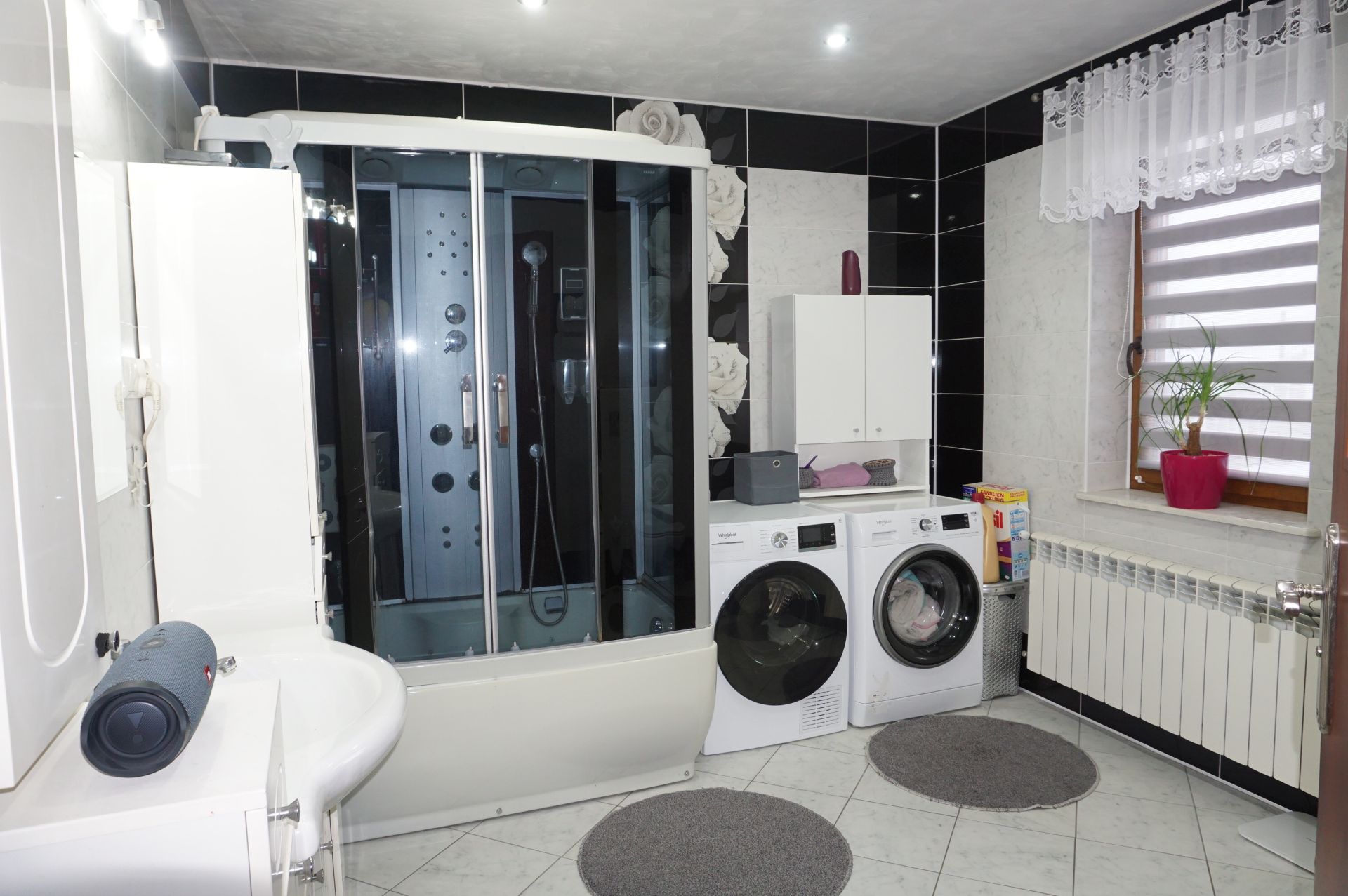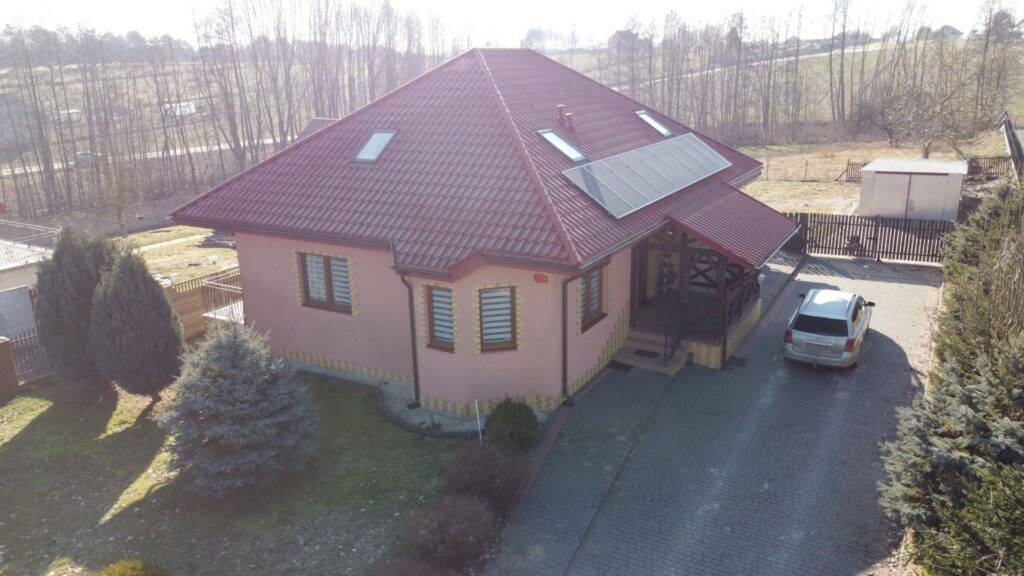 Dom parterowy z użytkowym poddaszem wybudowany w 2012 roku o powierzchni użytkowej 189,56m2 . Budynek wybudowany w technologii tradycyjnej murowany z pustaka ceramicznego, ocieplony styropianem, położona struktura; okna PCV, na podłogach na parterze panele, płytki, na poddaszu wykładzina dywanowa i płytki.